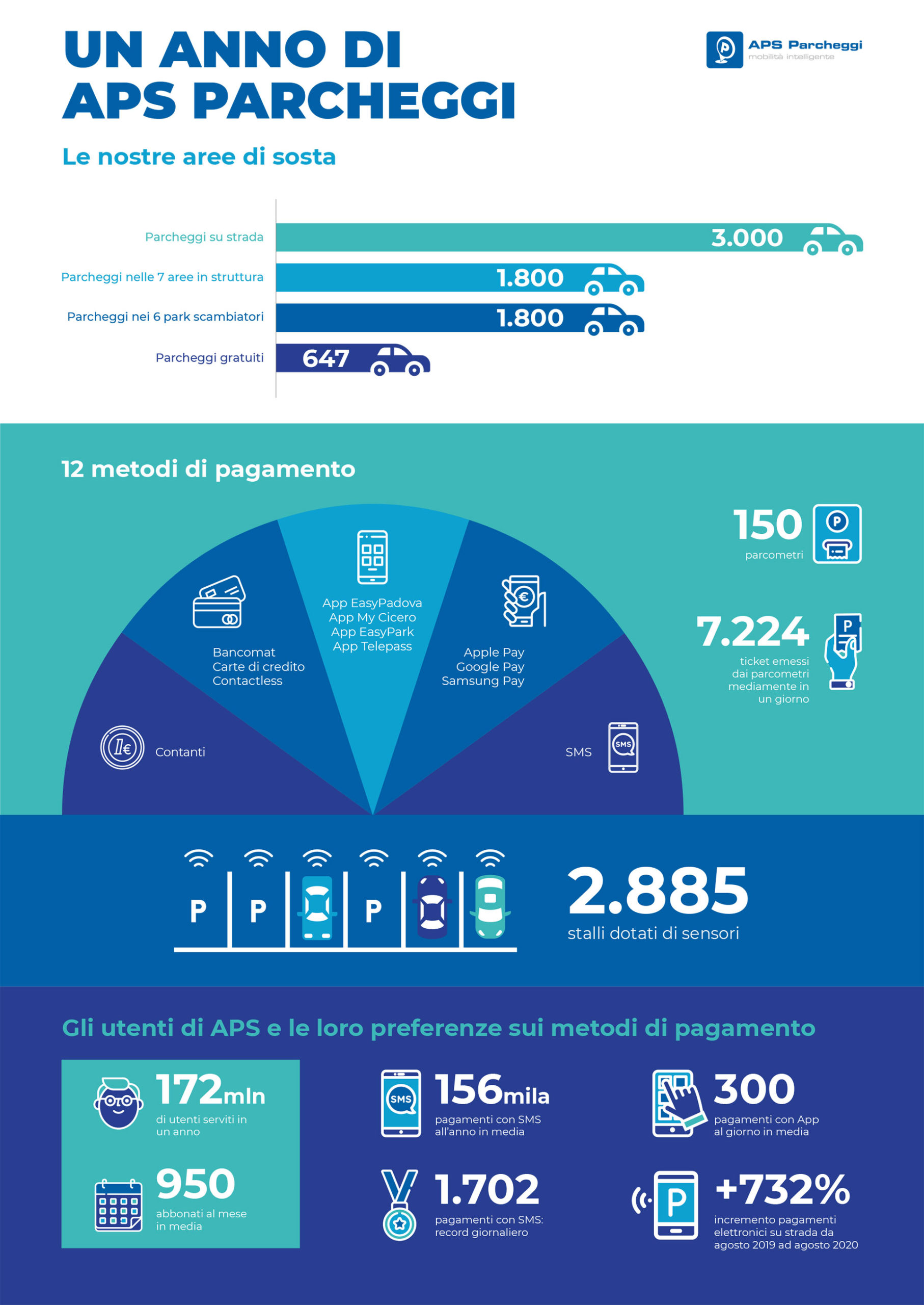 Attualmente i posti auto gestiti da APS a Padova sono circa 7000, che si dividono in:
