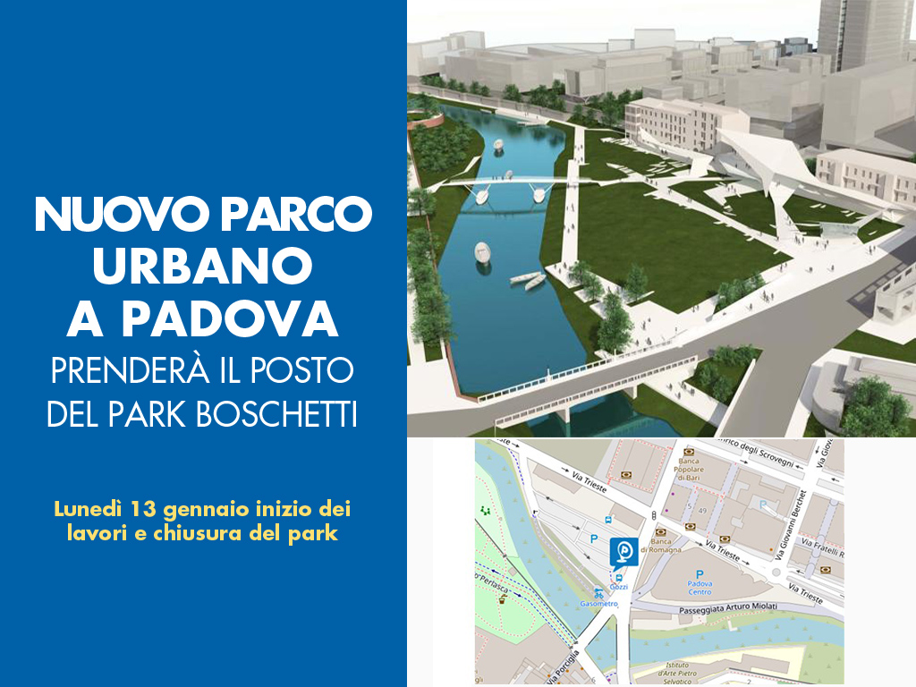 APS Holding annuncia che, a partire da lunedì 13 gennaio, inizieranno i lavori che daranno vita al nuovo parco urbano “Tito Livio”, adiacente all’attuale parco “Giardini dell’Arena” e in corrispondenza del park Boschetti, che chiuderà definitivamente.